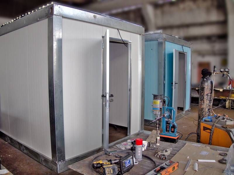 Modulul este realizat din profile specializate tip container, placat cu pereti sandwich cu izolatie de poliuretan, cu usi interioare de MDF si PVC la dusuri si WC, cu instalatie de incalzire cu convectoare termostatate, cu boiler electric la grupul sanitar, instalatie electrica cu lampi fluorescente, cu usi metalice la exterior precum si tamplatie PVC cu geamuri Termopan. Birourile si sala de sedinte sunt prevazute cu aer conditionat de tip split si unitate exterioara.
